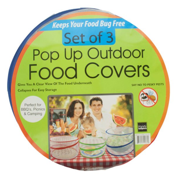 Keep your food bug-free with this 3-piece Pop-Up Outdoor Food Protector Covers Set. These covers protect bowls and plates to keep out pests while giving you a clear view of the food underneath. Better than domes, the sides of these covers extend straight up allowing for layer cakes, bowls or other large serving pieces up the eight inches high. Each measures approximately 15" , 14" and 12" in diameter. Comes packaged in a poly bag.,3 Pack Pop-Up Outdoor Food Protector Covers,Protector De Alimentos