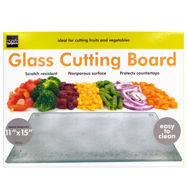 Ideal for cutting fruits and vegetables, this Small Tempered Glass Cutting Board is scratch resistant, nonporous and easy to clean. You can use this board as a trivet, as a cutting board, or as a server and feel confident knowing it can handle just about any job with style and durability. Measures approximately 11" x 15". Comes packaged in an individual box. Box measures approximately 15.25" x 0.5" x 11.25". ,Large Glass Cutting Board,Tabla Para Picar