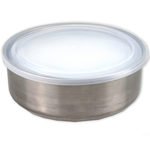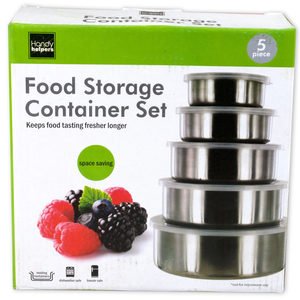 Seal in freshness and serve from the same container with this set of 5 durable Nesting Metal Food Storage Containers. Variously sized metal containers with clear snap-on plastic lids nest together for space-saving storage. Includes one 8-ounce, one 12-ounce, one 16-ounce, one 18-ounce and one 32-ounce container. Freezer and dishwasher safe. Comes packaged in an individual box. Package measures approximately 7.25" x 7.25" x 3".,Nesting Metal Food Storage Container Set,
